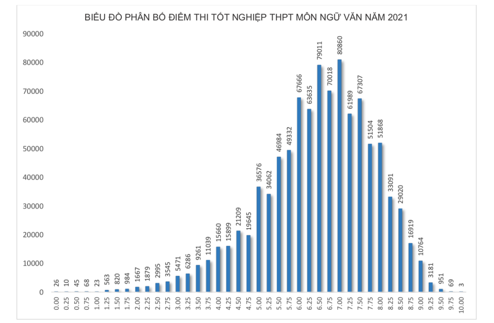 Số lượng thí sinh làm bài thi Ngữ văn là gần 981.600, nhiều hơn năm ngoái khoảng 3.600. Năm ngoái, điểm trung bình môn Ngữ văn là 6,47. Mức nhiều thí sinh đạt nhất là 7 điểm. Phổ điểm năm 2021 môn Ngữ văn như sau: