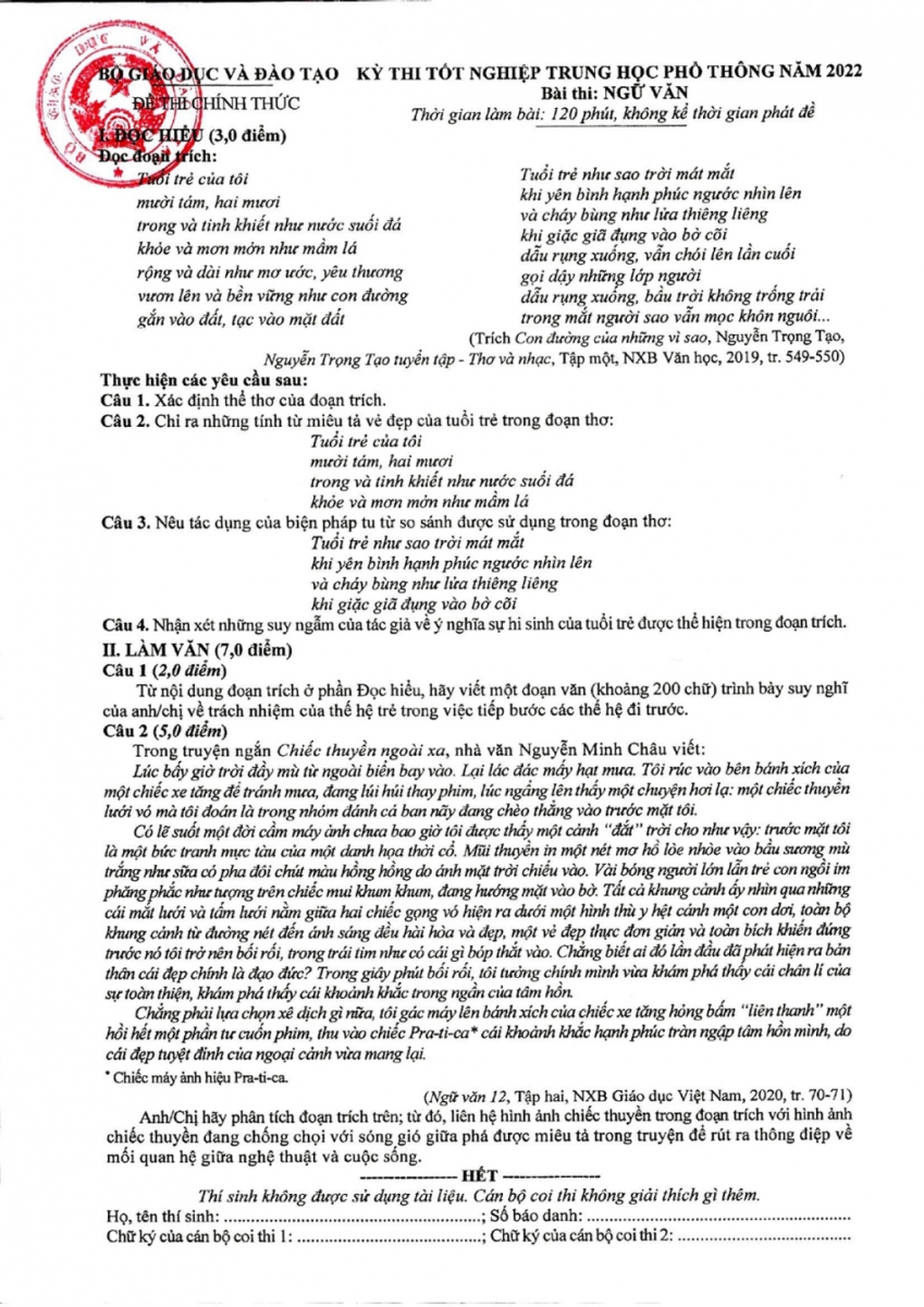 Ngữ văn là môn đầu tiên và cũng là môn duy nhất thi dưới hình thức tự luận ở kỳ thi tốt nghiệp THPT. Kết thúc buổi thi môn này sáng 7/7, nhiều thí sinh vui mừng vì những câu hỏi trong đề quen thuộc, tác phẩm "Chiếc thuyền ngoài xa" được đưa ra ở phần làm văn, chiếm 5 điểm, là tác phẩm trọng tâm, được giáo viên ôn kỹ lưỡng.